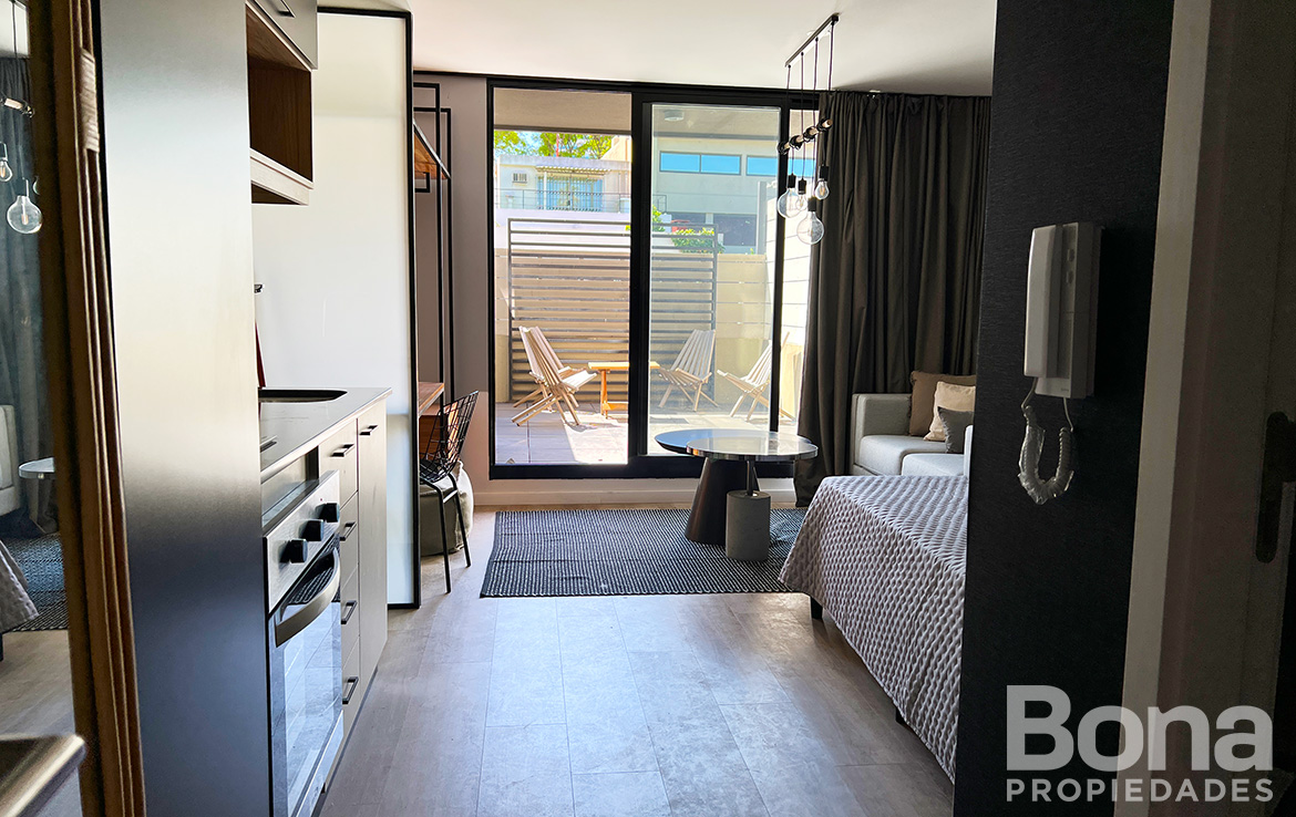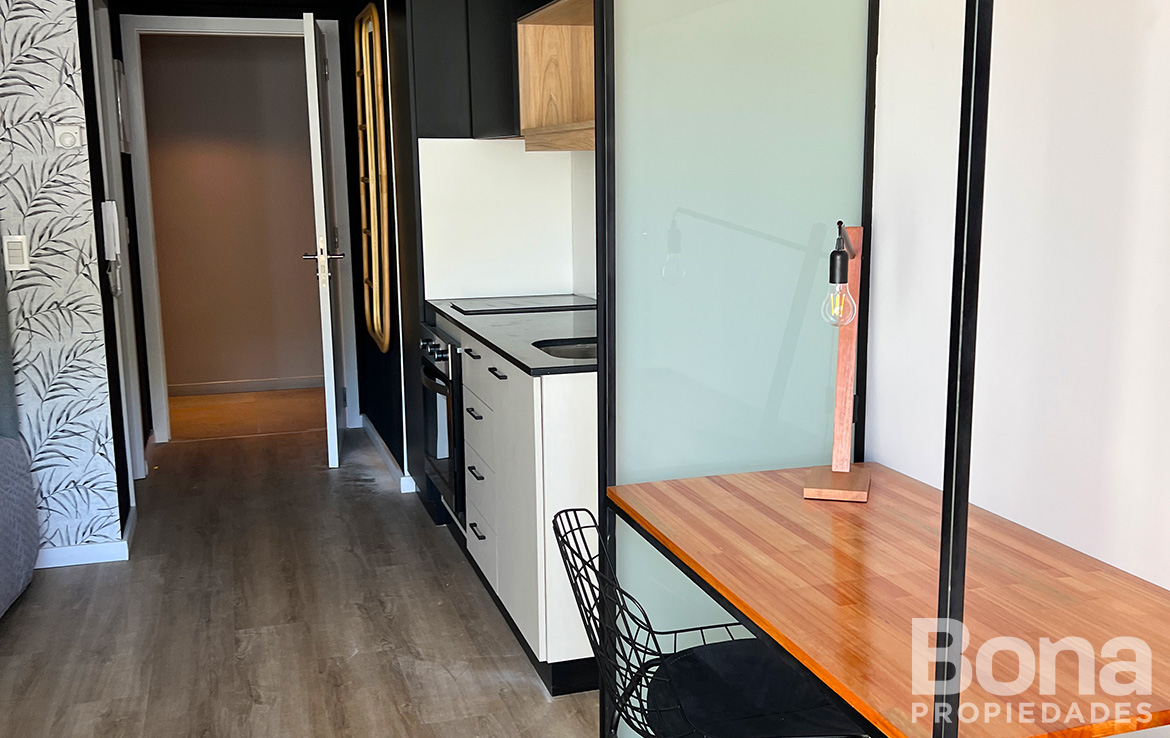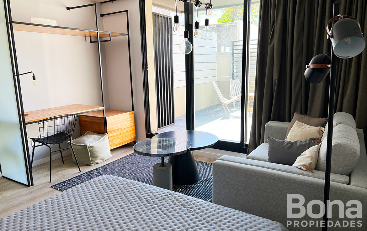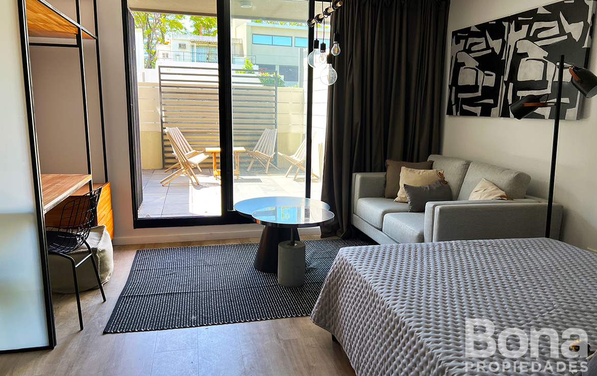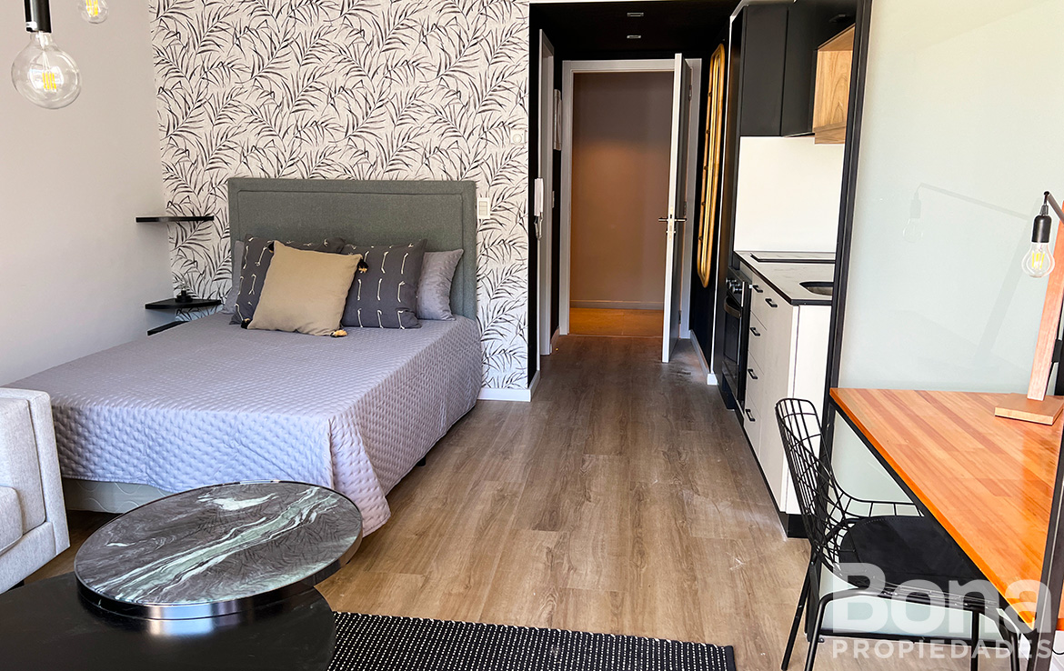 Tiene un gran ventanal con salida al patio. Si bien es un único ambiente, la planta permite equiparlo con dormitorio con cama 2 plazas y living con sofá y mesa ratona. Además cuenta con una cocina cómoda, una mesa tipo escritorio y patio muy soleado.